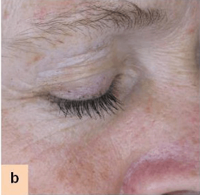 Stanje gub levega periorbitalnega dela, slikano iz levega profila: (d) pred uporabo placebo kreme, (e) po 6. tednih uporabe in (f) po 12. tednih uporabe placebo kreme.