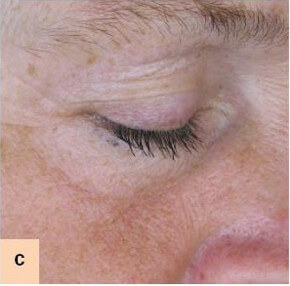 Stanje gub desnega periorbitalnega dela, slikano iz desnega profila: (a) pred uporabo testne kreme, (b) po 6. tednih uporabe in (c) po 12. tednih